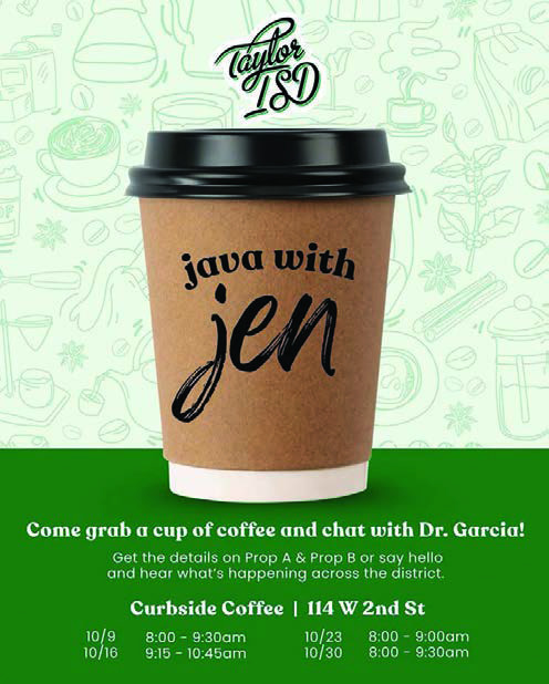 “At Taylor ISD, we believe that feedback is a gift. Whenever we can go out to our community and understand the things that are going well and the things that (LEFT) Jennifer Garcia-Edwardsen, superintendent of the Taylor Independent School District, hosts “Java with Jen” every Thursday in October to meet with residents and chat over a cup of coffee. A $147 million bond election is set for Nov. 4 and the veteran educator says she is happy to answer any questions.