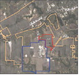 This illustration shows the Project Comal site in red, next to the Samsung Austin Semiconductor fabrication plant outlined in blue. The orange lines indicate Taylor’s city limits. Courtesy of the Planning & Zoning Commission