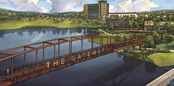 Architectural drawing of proposed development “The Gateway at Hutto” as viewed from the East Wilco Highway with an iconic bridge in the foreground and a conference hotel in the background. Courtesy of Rialto Studio and Hutto