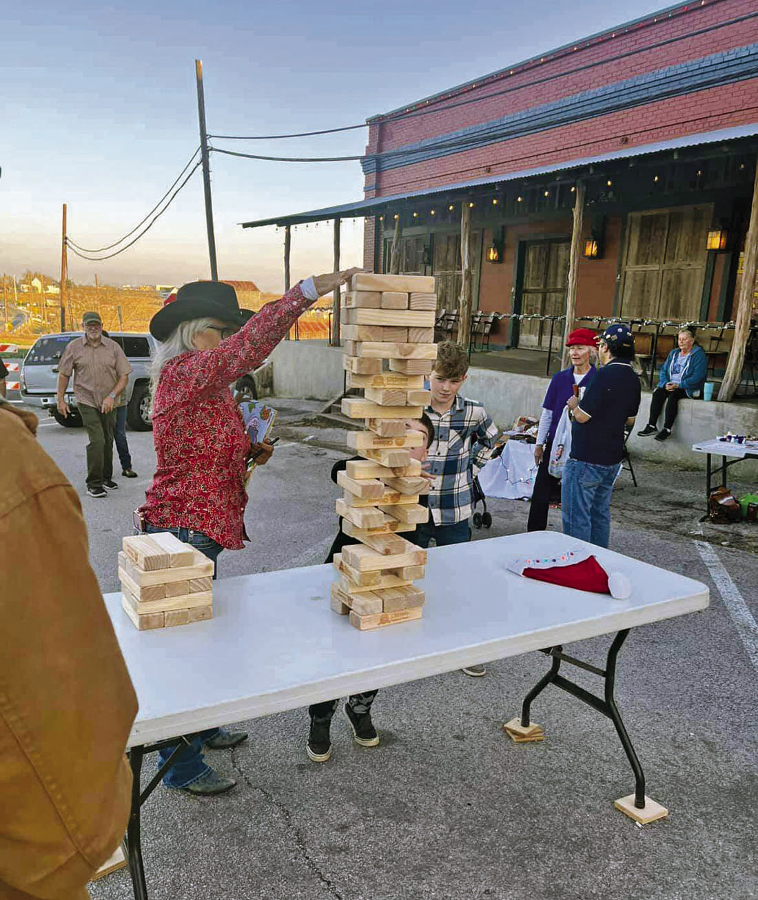 Connie Garza arranges Jenga blocks at the first Coupland Country Christmas Dec.20. Residents hope the celebration can become an annual affair. Photo by Machelle Sandbulte