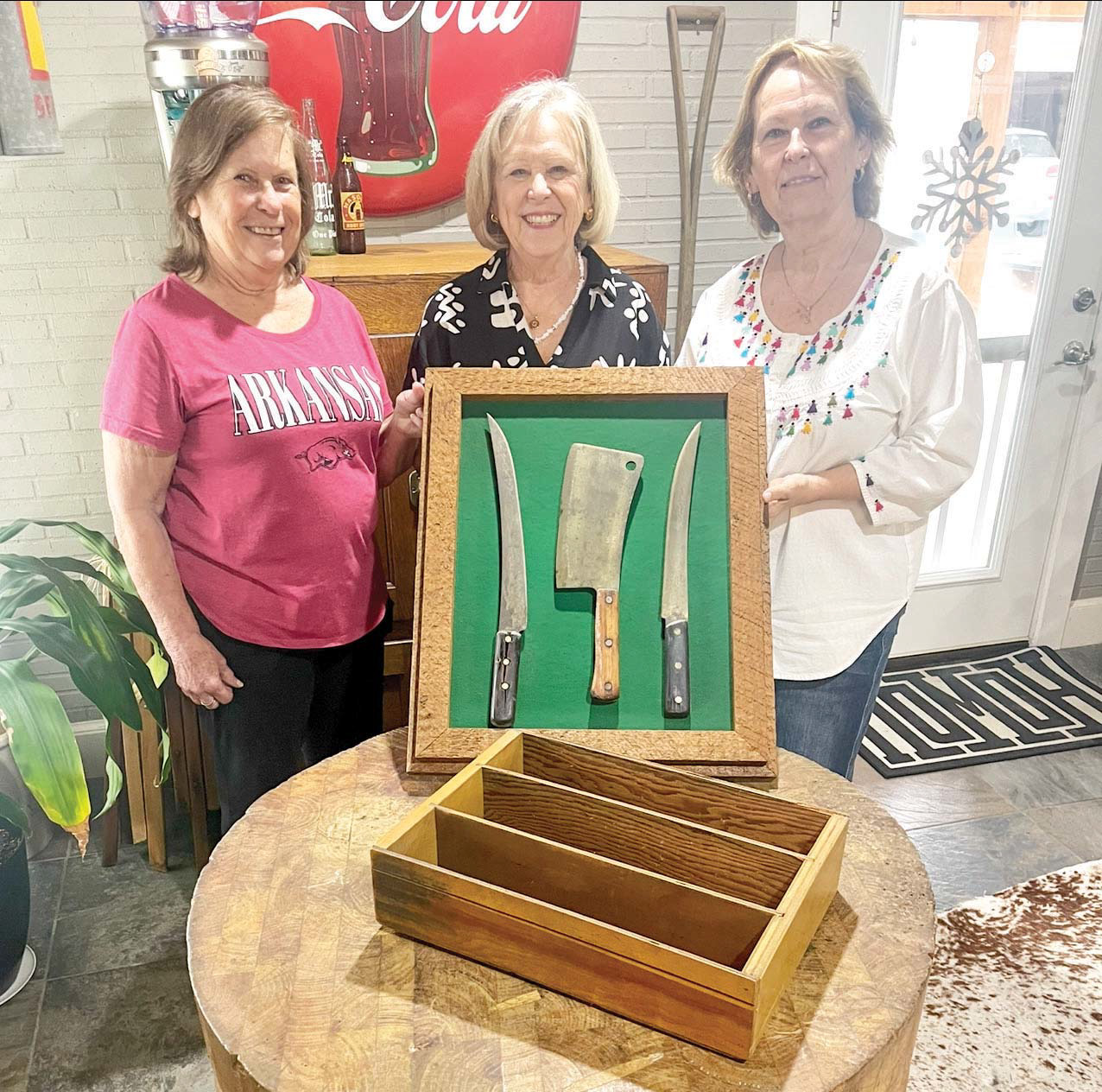 The Miller sisters still have the wooden meat block, butcher’s tools and the wooden box that held charge-account records for their family’s Taylor grocery and market. They are Pam Mikulencak (left), Moppy Miller and Heather Klotz. Photo by Tim Crow