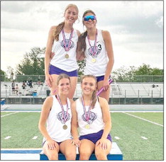 The Thrall Tigerettes 4x400-meter relay team poses for a photo after finishing first and advancing to the area round. Pictured top row, left to right: Brynn Leschber and Carleigh Roznovak; bottom row, left to right: Bentley Marek and Kinley Hoffman. Courtesy photo