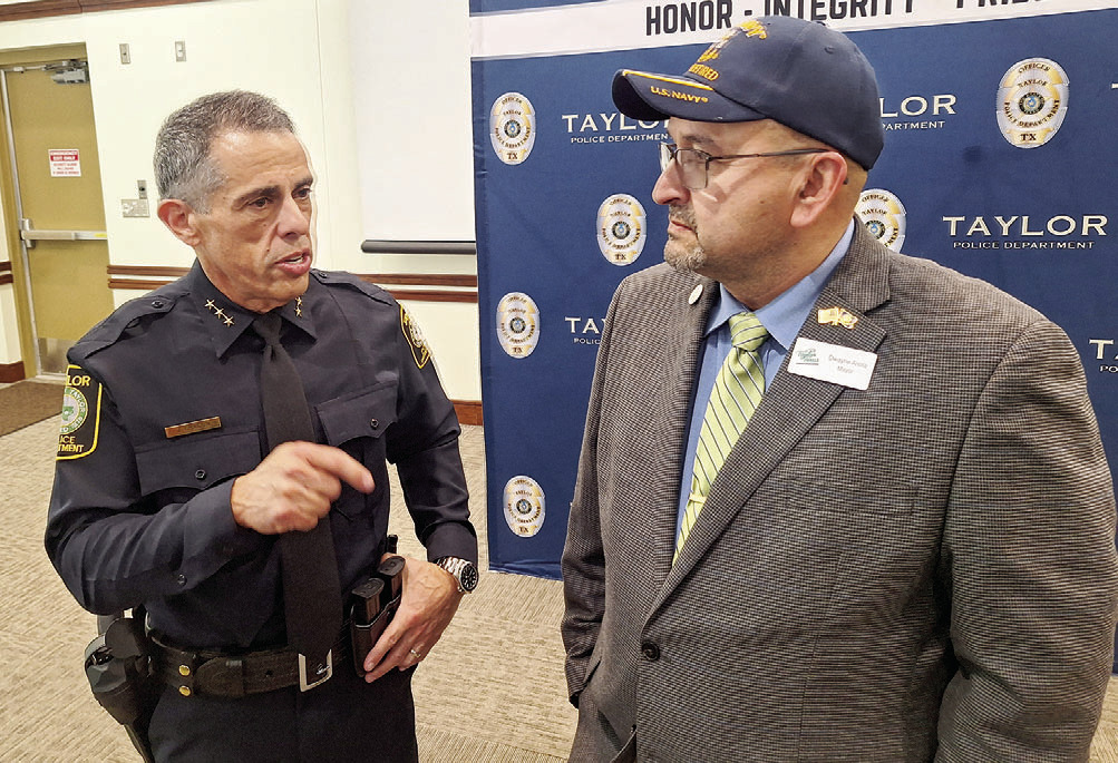 Taylor Chief of Police Joseph Chacon, left, visits with Taylor Mayor Dwayne Ariola prior to Chacon’s swear-in ceremony Wednesday afternoon at the Taylor Public Library.