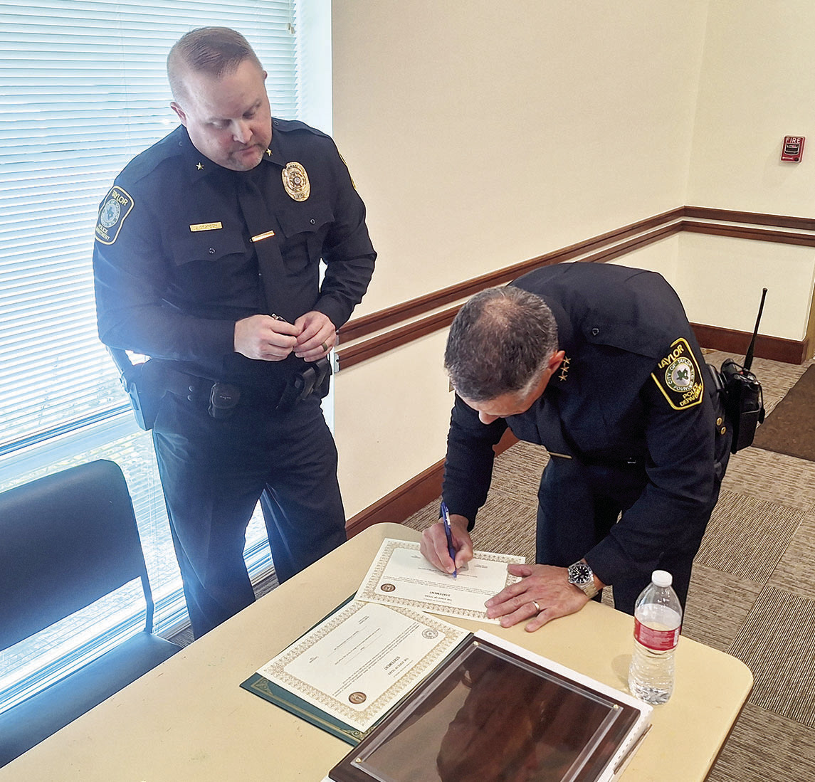 Joseph Branson, left, helps Taylor Chief of Police Joseph Chacon sign a certificate of employment Wednesday afternoon. Branson is the commander of Taylor PD and served as interim chief between the retirement of previous chief Henry Fluck in September and the hiring of Chacon last month.
